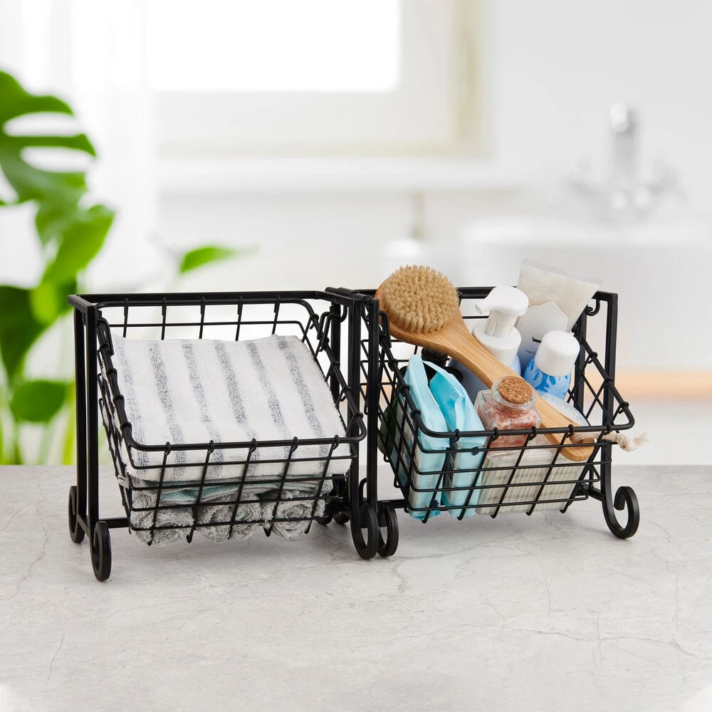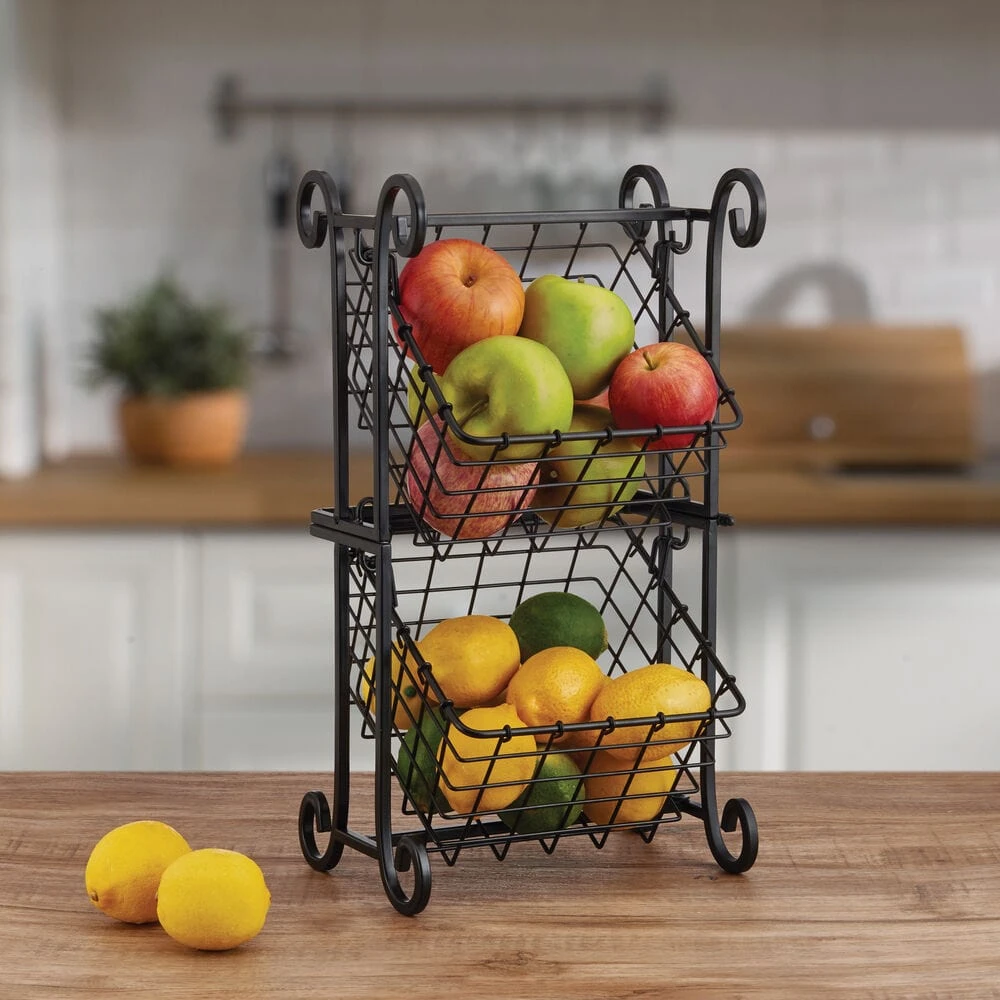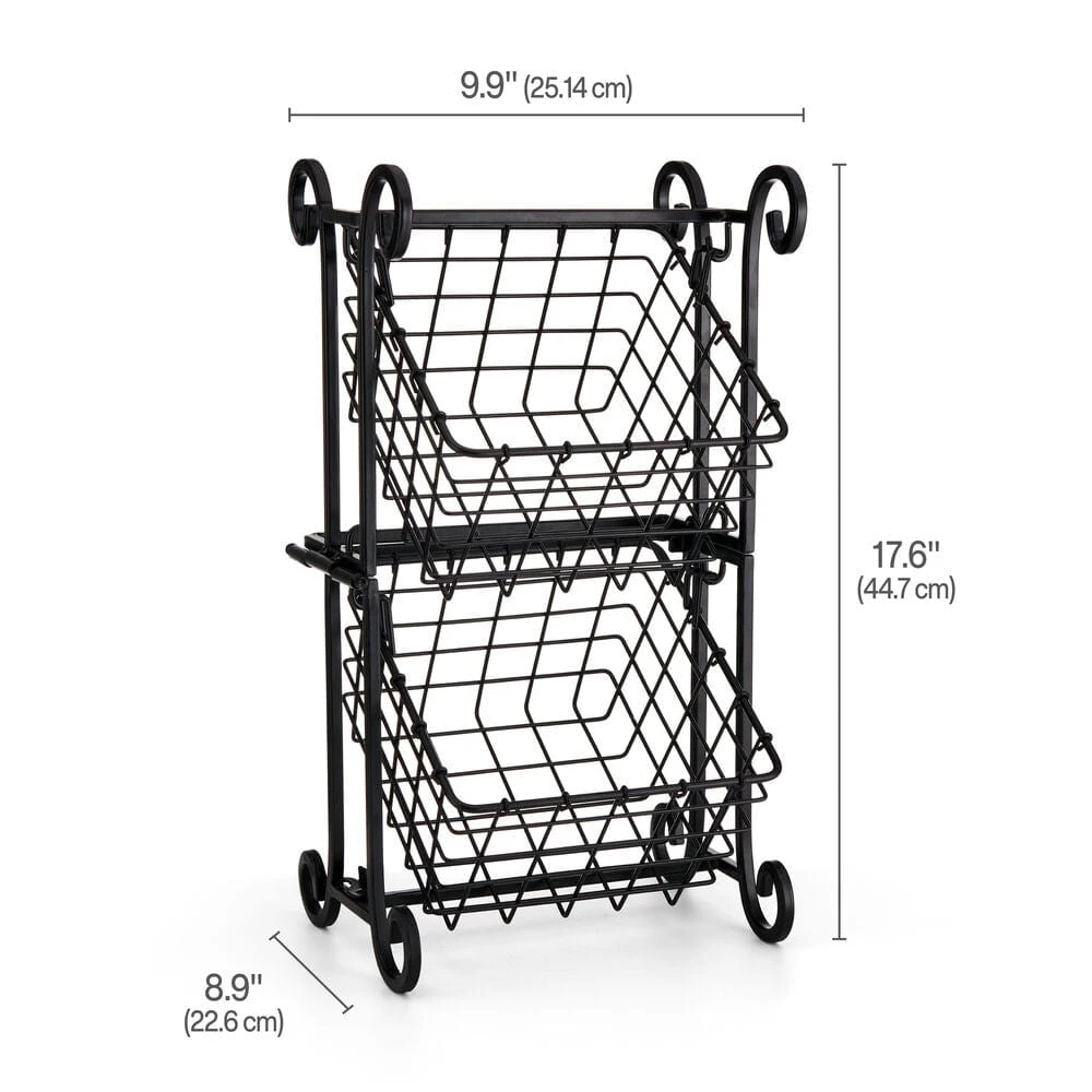 This Gourmet Basics Flip 2 Tier Storage Basket features a versatile design that can be used both vertically and horizontally and as individual baskets for customizable storage. The stunning black finish and intricate wire details will compliment any decor.