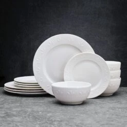 Adorned with a floral garland motif and a traditional embossed design, Gabriela creates an eye-catching and classic table setting to be enjoyed for years to come. Crafted of Stoneware featuring a Reactive Glaze exterior. Due to the nature and hand-crafted qualities of reactive glaze, no two pieces are exactly alike and will exhibit unique variations in color. Product may slightly differ from image shown. 16 piece dinnerware set, service for four, includes (4) each: 10-1/2 inch dinner plate, 8-1/2 inch salad plate, 6 inch (26 ounce) soup cereal bowl and 12 ounce mug. Microwave and dishwasher safe.