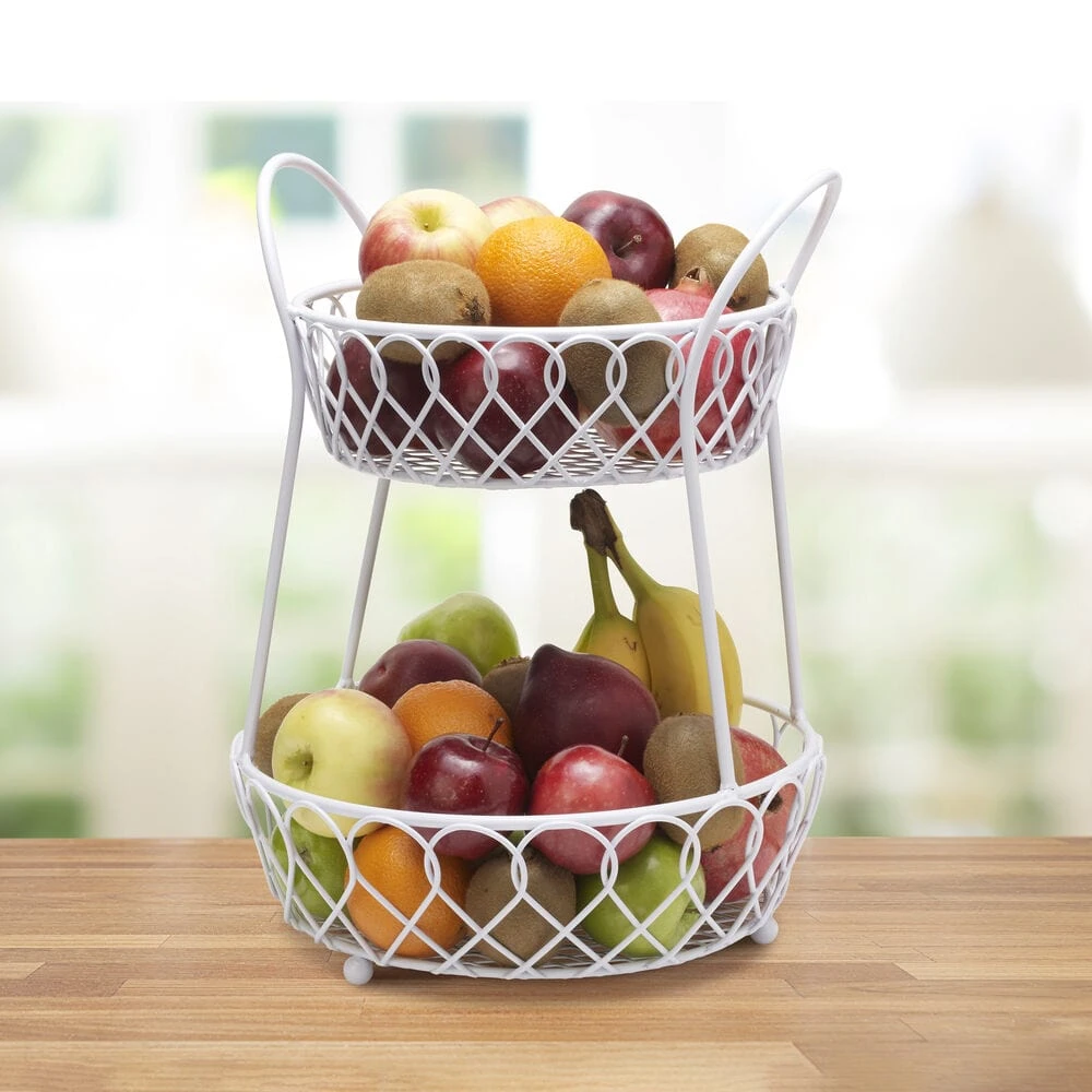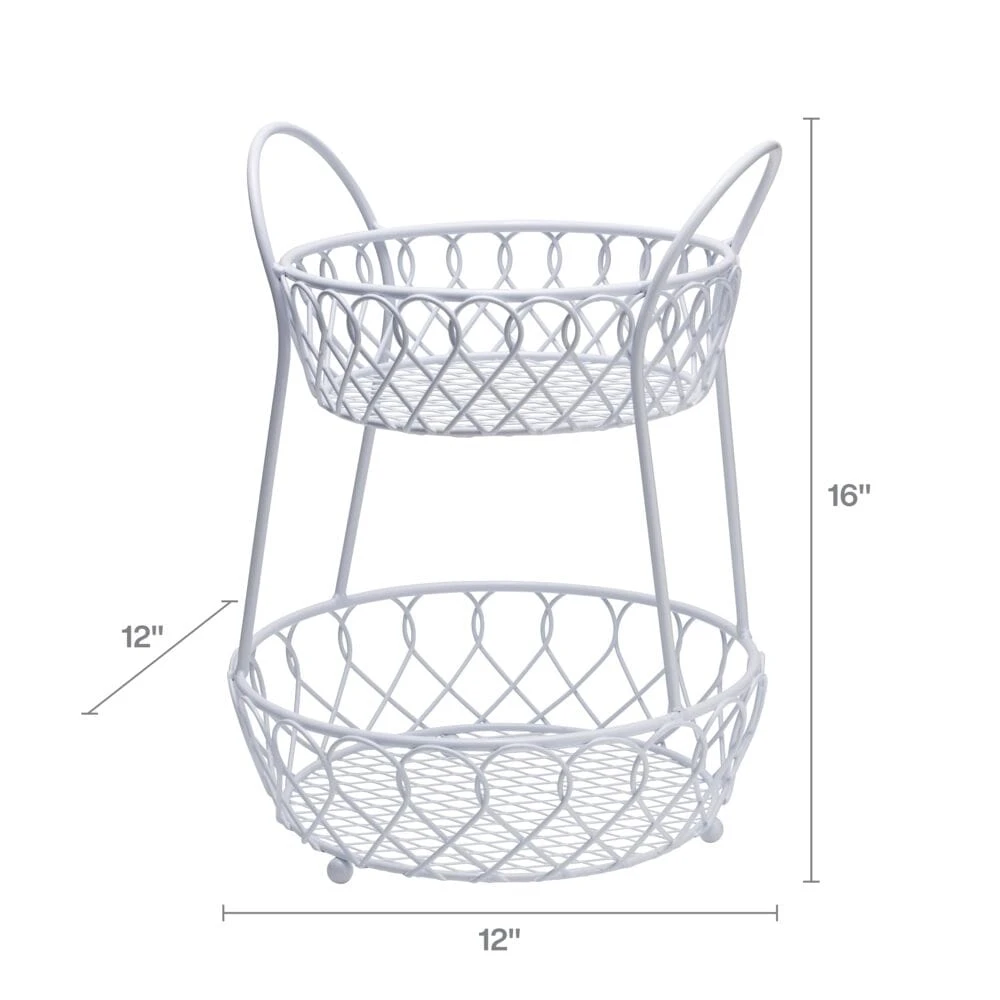 This Loop And Lattice 2 Tier Round Basket has an attractive white finish that will bring style to your décor. Features a 2-tier design to create more storage space while cutting down on counter clutter. Handcrafted from carbon structured steel for long-lasting beauty even under rigorous use. Wipe clean with a damp cloth. Countertop basket measures 16 inch high x 12-1/4 inch diameter. Bottom basket measures 11-1/2 inch diameter; Top basket measures 9-1/2 inch diameter. This product contains Carbon Black. For more information about chemicals in this product, visit www.lifetimebrands.com/ab1200