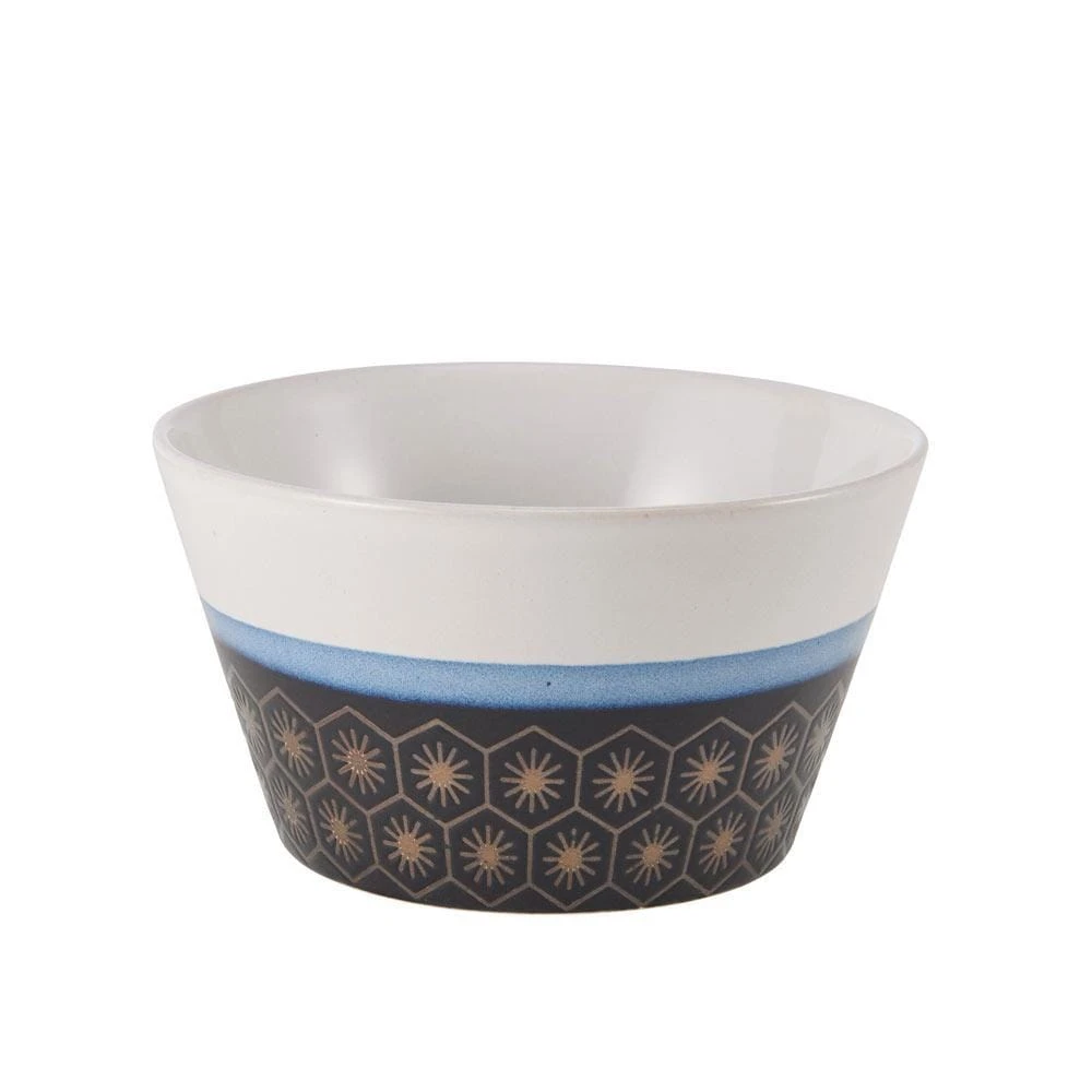 This Pfaltzgraff Marcus Conical Set of 6 Soup Cereal Bowls, in an array of colors, features brown bottoms, adorned with unique silk screen geometric patterns, and solid, complementary color tops.
