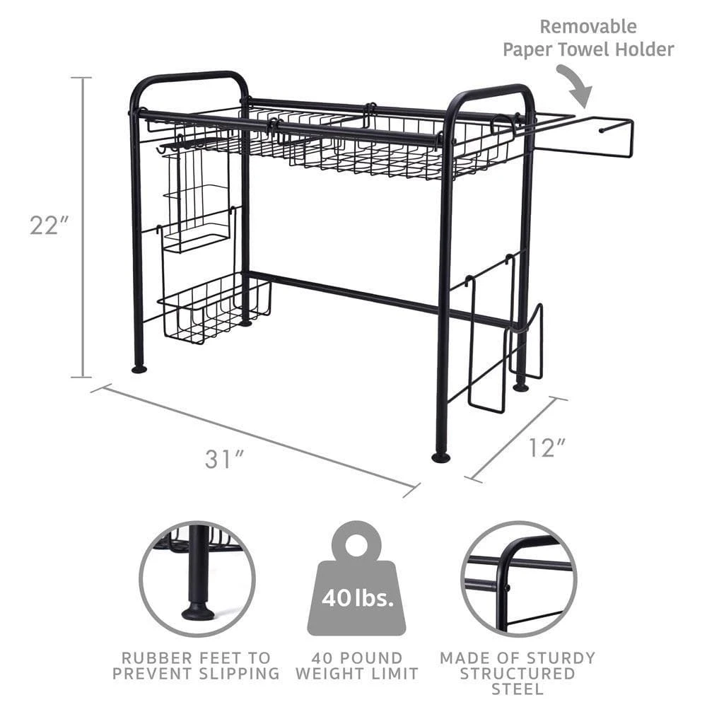 This Gourmet Basics Black Dish Rack Organizer features 2-tiers of numerous wire frame baskets, hooks, and a built-in paper towel holder. All, the baskets are removable so you arrange them to suit your needs. Whether you need space to drip-dry dishes and utensils over the sink, or storage for cleaning products in a larger cabinet, this unique organizer will hold your items and keep them in their own space.