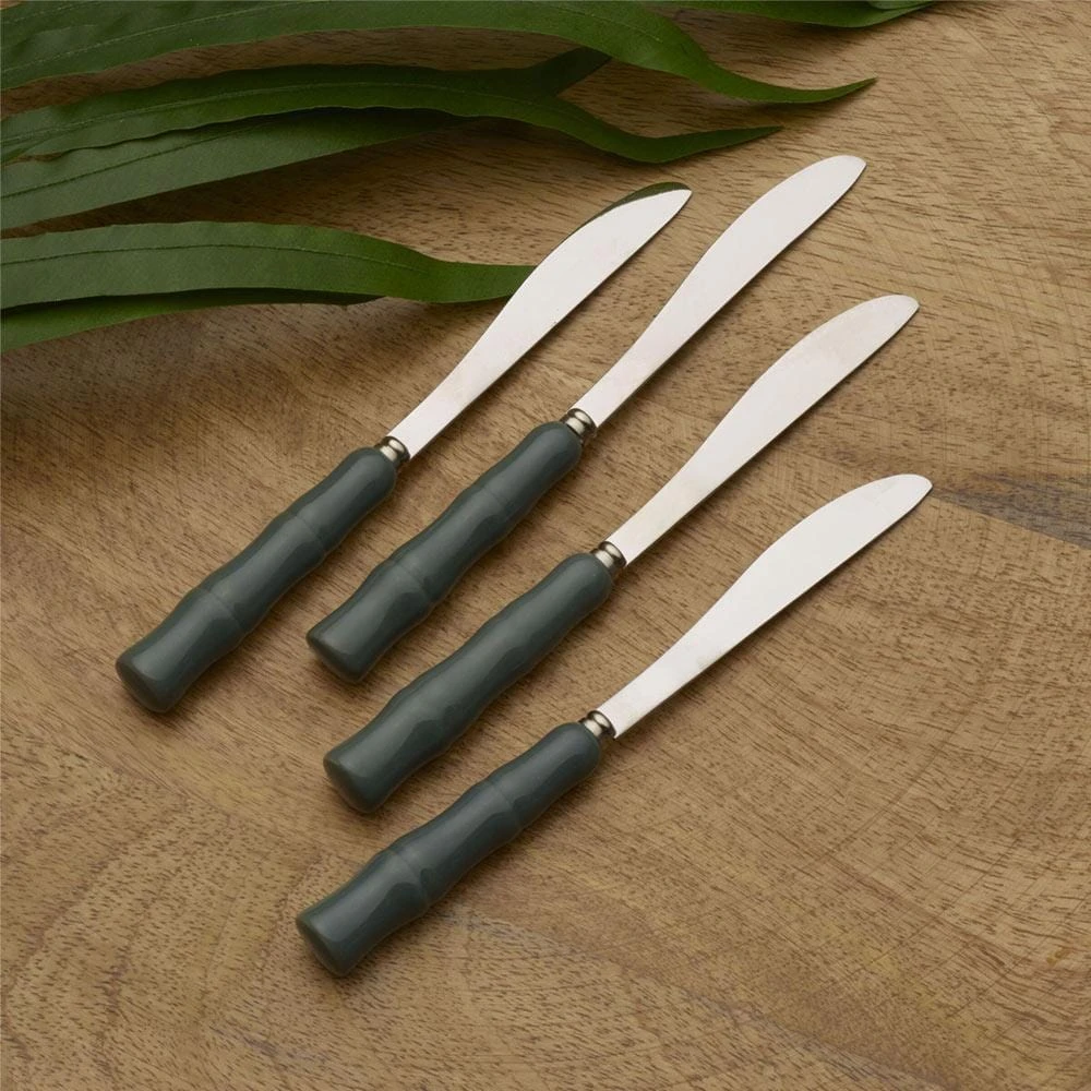This International Silver Palm Beach Set of 4 Spreaders feature sage green ceramic handles, with a charming bamboo design that offers a textured surface for a secure grip. Blades are crafted of 18/0 stainless steel. Set of 4 spreaders, each measures 7-1/2 inch long. Dishwasher safe.