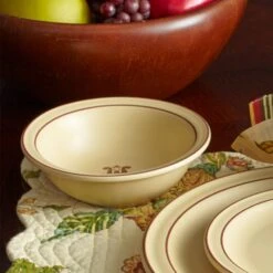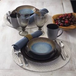 This could also be known as the ‘bread’ plate, ‘dessert’ plate, ‘piece of fruit’ plate, or the ‘sneaking a snack’ plate. Constructed of stoneware. Microwave and dishwasher safe. Set of 4 salad plates with blue band, each measures 9 inch diameter.