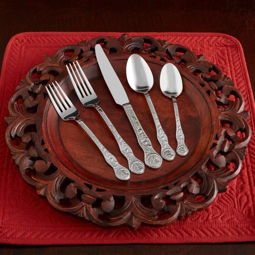 This 20 Piece Turkey Flatware Set is crafted from 18/0 stainless steel. Each handle is adorned with a turkey and fall leaves, and will be a beautiful addition to your Thanksgiving or fall tablesetting. 20 piece set, service for four, includes (4) each of: dinner fork, salad fork, dinner knife, dinner spoon and teaspoon. Dishwasher safe.