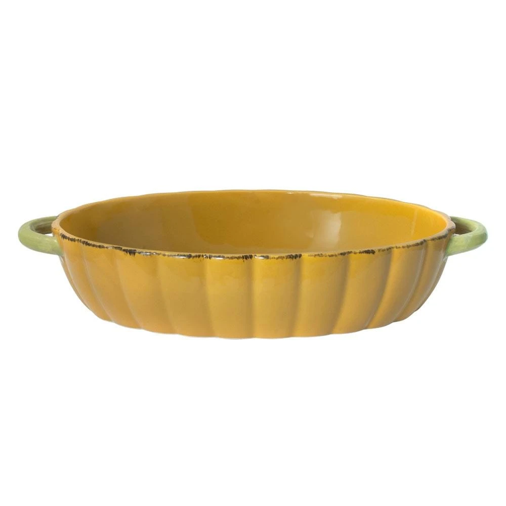 This Oval Pumpkin Baker will add a festive accent to your table or buffet. It conveniently travels from oven to table, the end handles make it easy to carry. and the no corners design makes clean-up a snap. Useful for serving vegetables, side dishes, heated dinner rolls, muffins and more! Crafted of stoneware. Microwave, dishwasher and oven safe up to 450° F. Oval baker measures 13-1/4 inch long x 6 inch wide and holds 2.2 quarts.