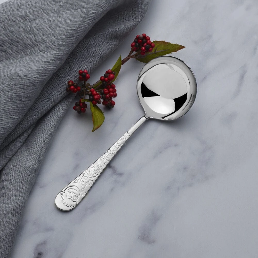 This Towle Everyday Santa Gravy Ladle is delicately curved with traditional teardrop handle silhouettes adorned with snowflakes and a jolly Santa face.